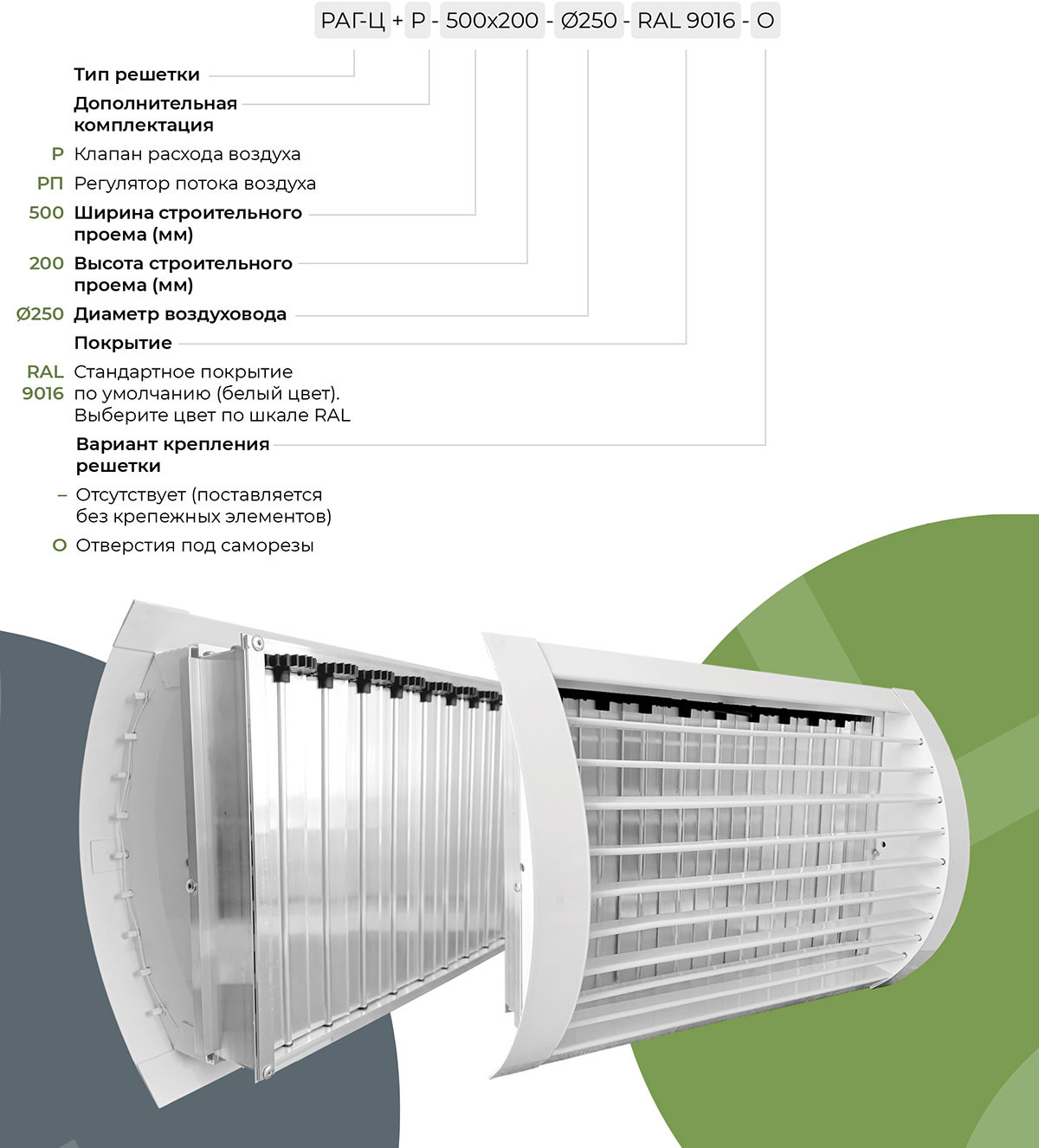 Цилиндрическая решетка РАГ-Ц+P оснащена клапаном расхода воздуха (КРВ). Решетка используется в приточно-вытяжной вентиляции и системах кондиционирования воздуха и предназначена для установки в круглый воздуховод. Она регулирует объем и направление воздушного потока вверх и вниз.