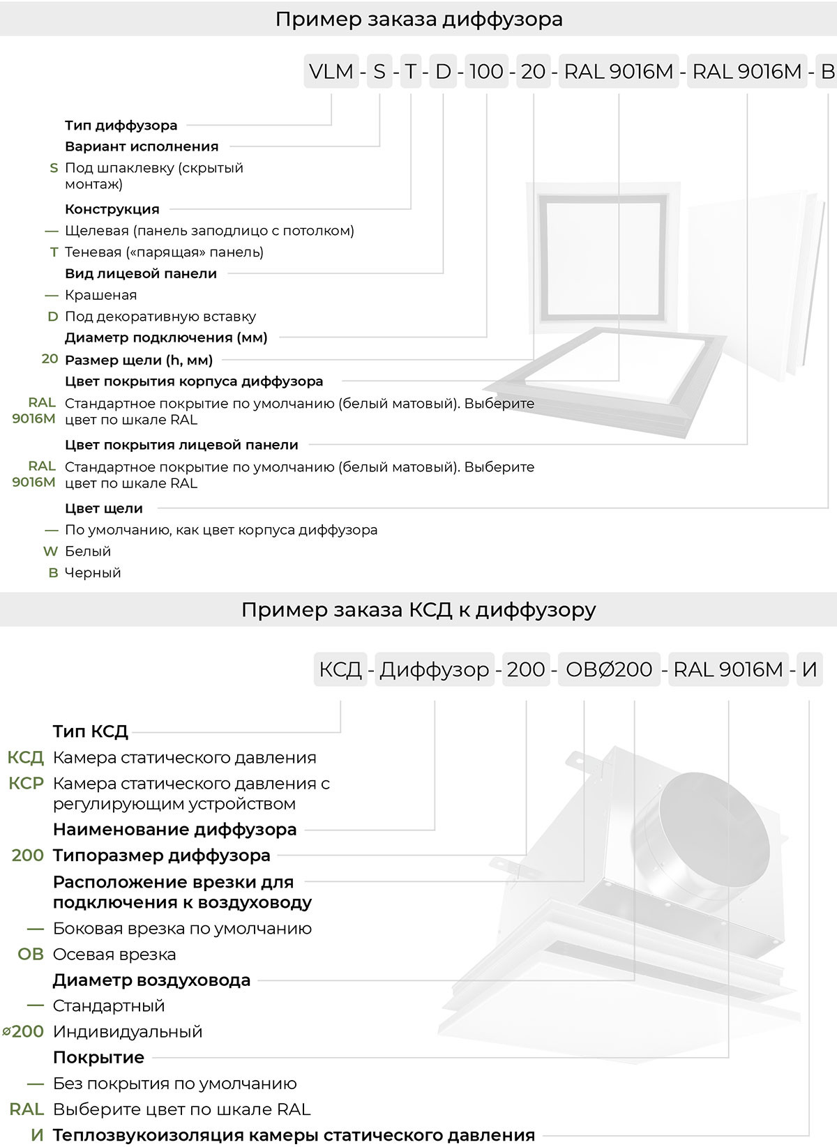 Рамка диффузора изготавливается из экструдированного алюминиевого профиля АД31 по ГОСТ 22233-2018. Лицевая панель - из оцинкованной стали 0,9 мм. По умолчанию корпус диффузора и лицевая панель окрашиваются в белый цвет RAL 9016М матовый. По индивидуальному заказу возможна окраска в любой цвет по шкале RAL. КСД изготавливается из оцинкованной листовой стали 0,4 - 1,5 мм в зависимости от размера и пожелания заказчика. По умолчанию КСД поставляется в неокрашенном виде.